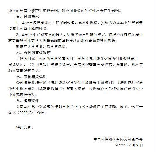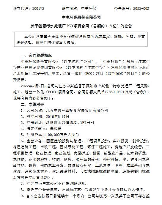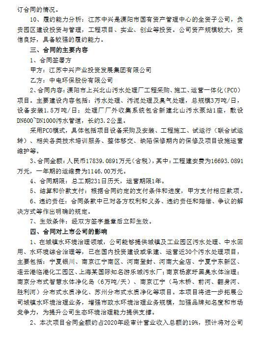2022年2月9日,公司與江蘇中興簽署了溧陽市上興北山污水處理廠工程采購、施工、運(yùn)營一體化(PCO)項目合同,合同總額人民幣約1.78億元(含稅)。